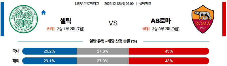 셀틱 대 AS로마 UEFA유로파리그 12월12일 맞대결 생중계, 스포츠중계, 스포츠분석