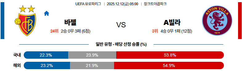 이 경기는 누가 더 많이 뛰느냐보다, 어느 쪽이 더 영리하게 공간을 활용하느냐가 핵심입니다. 바젤이 홈에서의 에너지와 측면 압박으로 초반 기세를 잡을 여지는 있지만, 중앙으로 빨려 들어가는 순간마다 하프스페이스가 열리는 구조적인 약점이 드러날 수 있습니다. 반면 아스톤빌라는 틸레만스가 중원에서 전환의 박자를 조율하고, 왓킨스와 맥긴이 그 리듬에 맞춰 침투를 가져가는 전형적인 프리미어리그식 패턴을 준비할 가능성이 높습니다. 결국 아스톤빌라가 공간을 더 정확하게 찾는 시간이 길어질 것으로 보이며, 그 차이가 스코어보드에 반영될 가능성이 높습니다.