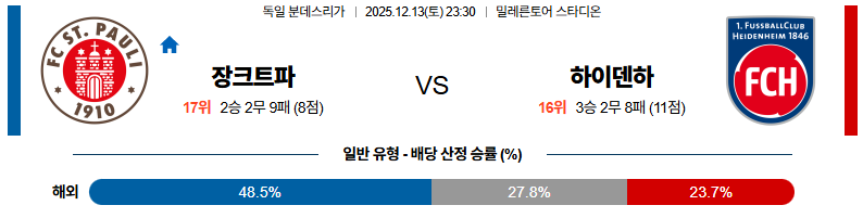 상파울리 대 하이덴하임 분데스리가 12월13일 맞대결 생중계, 스포츠중계, 스포츠분석
