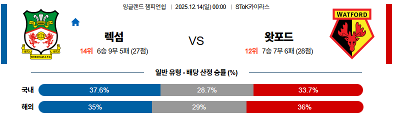 렉섬 대 왓포드 잉글랜드챔피언쉽 12월14일 맞대결 생중계, 스포츠중계, 스포츠분석