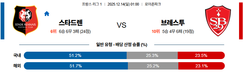 스타드렌 대 브레스트 리그앙 12월14일 맞대결 생중계, 스포츠중계, 스포츠분석