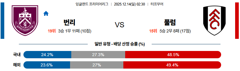 번리 대 풀럼 프리미어리그 12월14일 맞대결 생중계, 스포츠중계, 스포츠분석