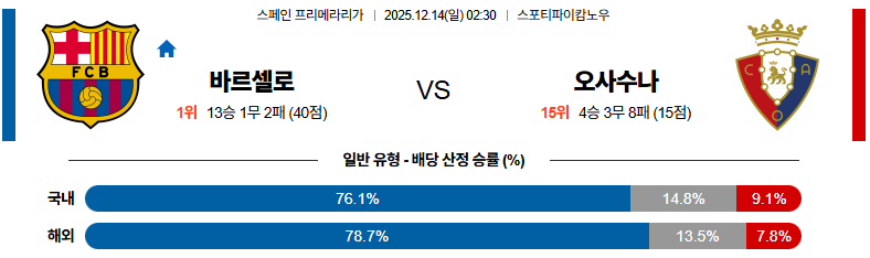 바르셀로나 대 오사수나 라리가 12월14일 맞대결 생중계, 스포츠중계, 스포츠분석