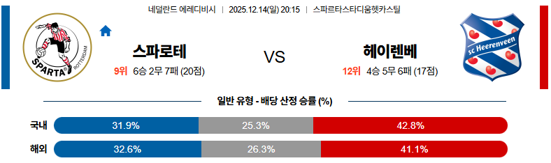 스파르타 로테르담은 반 베르헌의 좌측 돌파와 토른스트라의 컷백, 리우리첸의 박스 마무리로 이어지는 공격 루트를 이미 여러 경기에서 증명해 왔습니다. 헤렌벤은 중원에서의 패싱과 전개 능력은 갖추고 있지만, 수비 전환과 간격 관리에서 불안 요소가 남아 있습니다. 결국 스파르타 로테르담의 패턴 플레이와 홈 경기장의 분위기를 고려할 때, 스파르타 로테르담이 승리할 가능성이 높다고 판단됩니다.