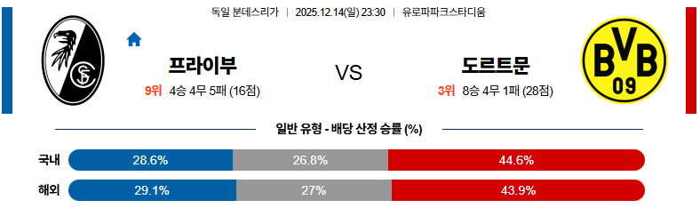 프라이부르크 대 도르트문트 분데스리가 12월14일 맞대결 생중계, 스포츠중계, 스포츠분석