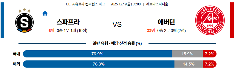 12월19일 스파르타프라하:애버딘 UEFA유로파컨퍼런스 분석 및 예측 스포츠중계:스포츠무료중계
