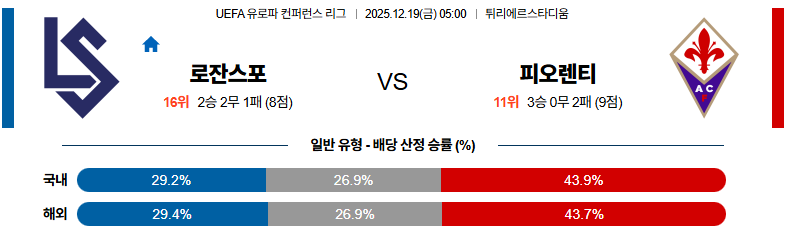 12월19일 로잔:피오렌티나 UEFA유로파컨퍼런스 분석 및 예측 스포츠중계:스포츠무료중계