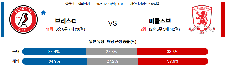 12월21일 브리스톨시티:미들즈브러 잉글랜드챔피언쉽 분석 및 예측 스포츠중계:스포츠무료중계