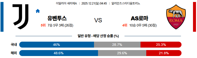 12월21일 유벤투스:AS로마 세리에A 분석 및 예측 스포츠중계:스포츠무료중계