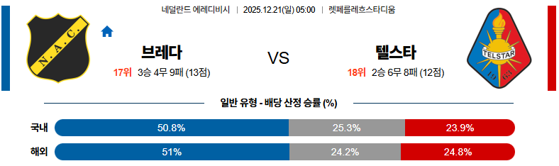 12월21일 브레다:텔스타 에레디비지 분석 및 예측 스포츠중계:스포츠무료중계