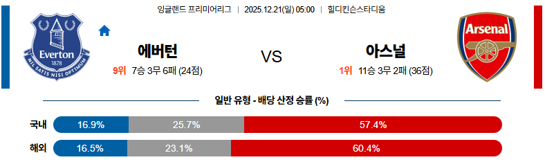 12월21일 에버턴:아스널 프리미어리그 분석 및 예측 스포츠중계:스포츠무료중계