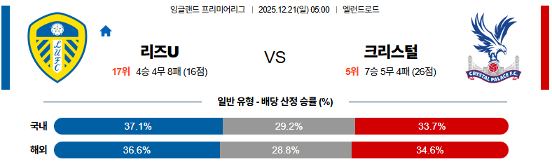 12월21일 리즈:크리스탈팰리스 프리미어리그 분석 및 예측 스포츠중계:스포츠무료중계