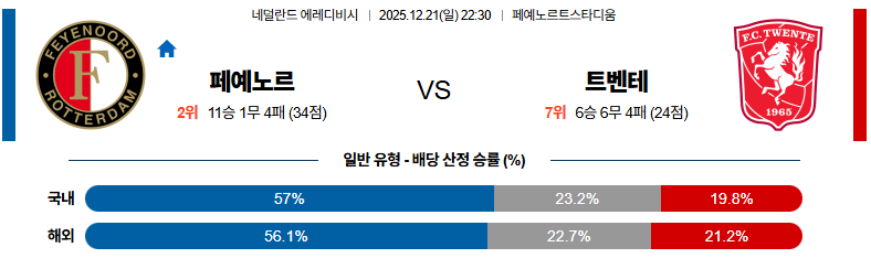 12월21일 페예노르트:트벤테 에레디비지 분석 및 예측 스포츠중계:스포츠무료중계
