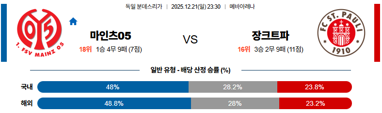 12월21일 마인츠:상파울리 분데스리가 분석 및 예측 스포츠중계:스포츠무료중계