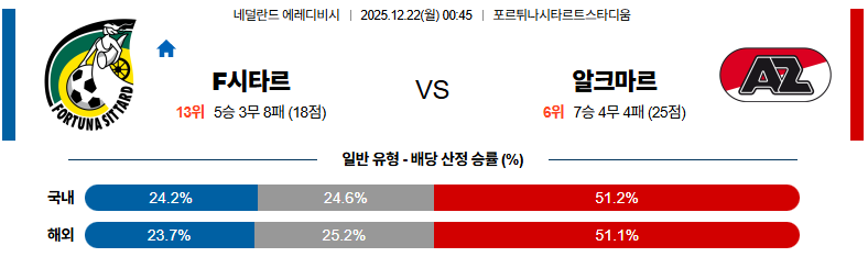 12월22일 시타르트:알크마르 에레디비지 분석 및 예측 스포츠중계:스포츠무료중계