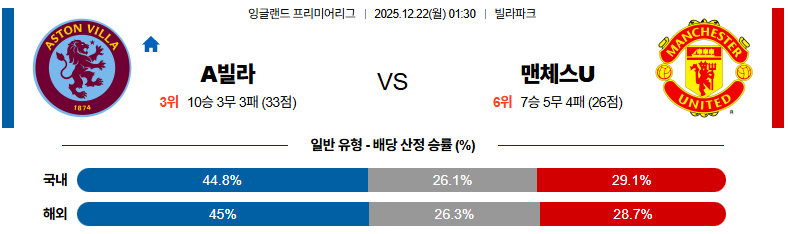 12월22일 아스톤빌라:맨유 프리미어리그 분석 및 예측 스포츠중계:스포츠무료중계