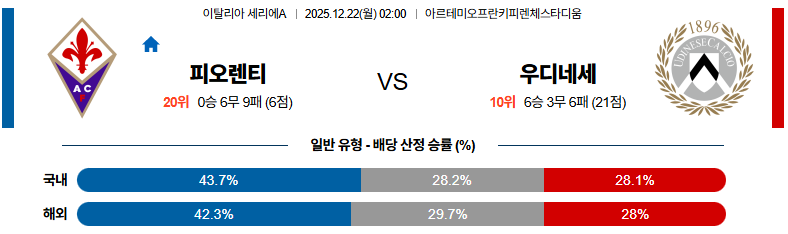 12월22일 피오렌티나:우디네세 세리에A 분석 및 예측 스포츠중계:스포츠무료중계
