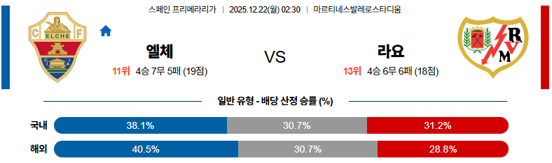 12월22일 엘체:라요 라리가 분석 및 예측 스포츠중계:스포츠무료중계