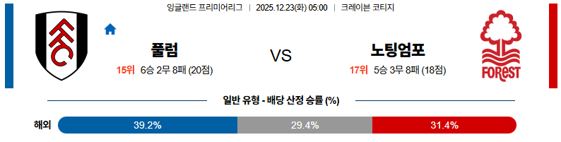 12월23일 풀럼:노팅엄 프리미어리그 분석 및 예측 스포츠중계:스포츠무료중계