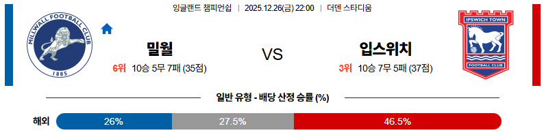 12월26일 밀월:입스위치 잉글랜드챔피언쉽 분석 및 예측 스포츠중계:스포츠무료중계