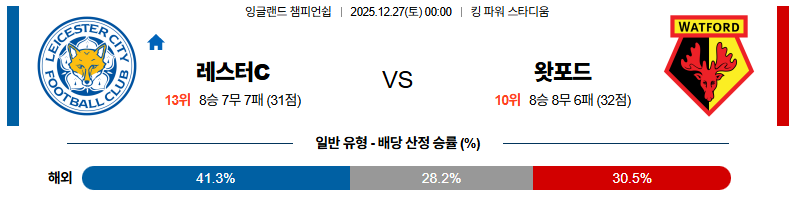 12월27일 레스터시티:왓퍼드 잉글랜드챔피언쉽 분석 및 예측 스포츠중계:스포츠무료중계
