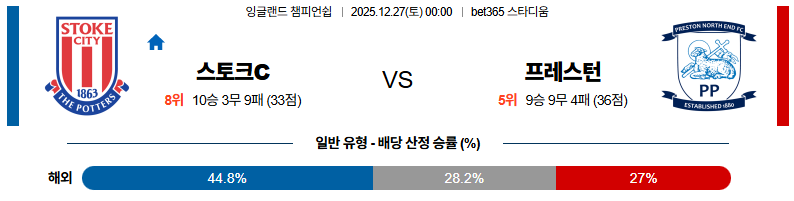 12월27일 스토크시티:프레스턴 잉글랜드챔피언쉽 분석 및 예측 스포츠중계:스포츠무료중계