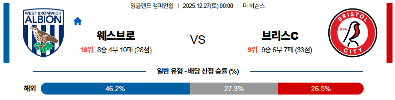 12월27일 웨스트브로미치:브리스톨 잉글랜드챔피언쉽 분석 및 예측 스포츠중계:스포츠무료중계