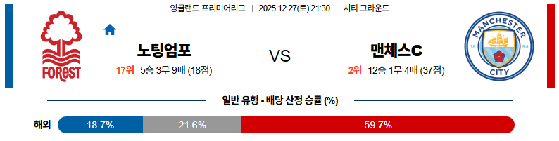 12월27일 노팅엄:맨시티 프리미어리그 분석 및 예측 스포츠중계:스포츠무료중계