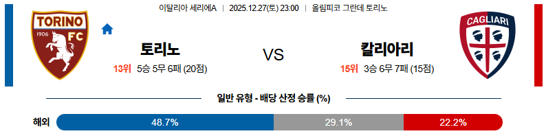 12월27일 토리노:칼리아리 세리에A 분석 및 예측 스포츠중계:스포츠무료중계