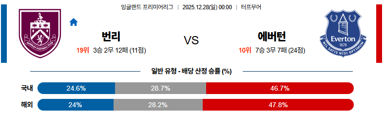 12월28일 번리:에버턴 프리미어리그 분석 및 예측 스포츠중계:스포츠무료중계