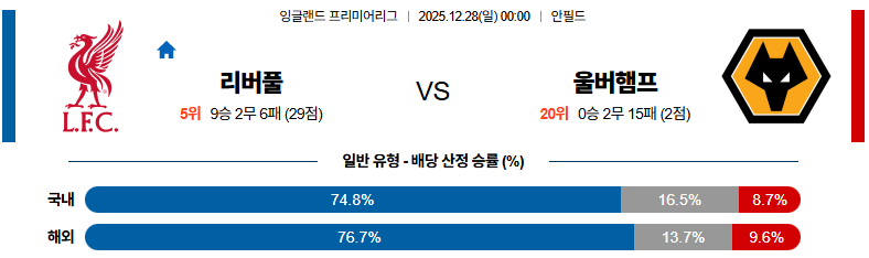 12월28일 리버풀:울버햄튼 프리미어리그 분석 및 예측 스포츠중계:스포츠무료중계