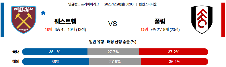 12월28일 웨스트햄:풀럼 프리미어리그 분석 및 예측 스포츠중계:스포츠무료중계