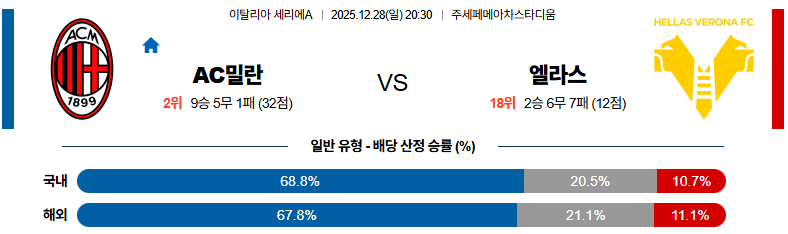 12월28일 AC밀란:베로나 세리에A 분석 및 예측 스포츠중계:스포츠무료중계