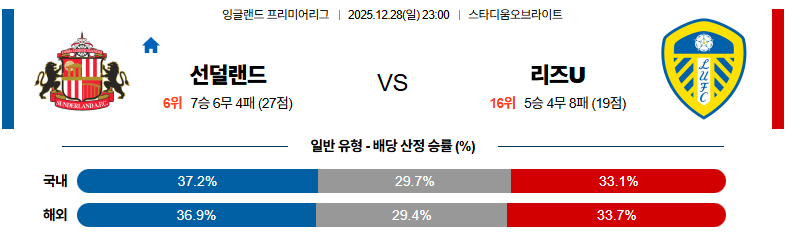 12월28일 선덜랜드:리즈 프리미어리그 분석 및 예측 스포츠중계:스포츠무료중계