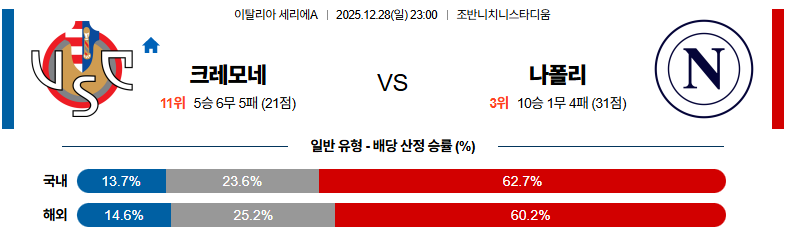 12월28일 크레모네:나폴리 세리에A 분석 및 예측 스포츠중계:스포츠무료중계
