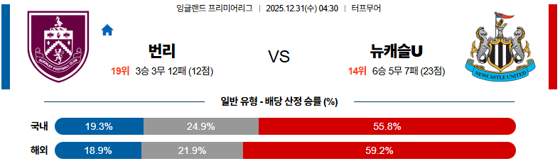 12월31일 번리:뉴캐슬 프리미어리그 분석 및 예측 스포츠중계:스포츠무료중계