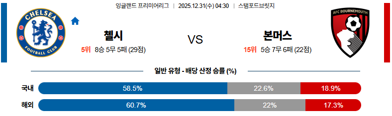 12월31일 첼시:본머스 프리미어리그 분석 및 예측 스포츠중계:스포츠무료중계