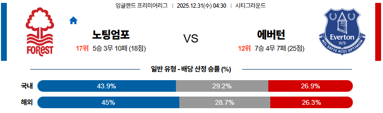 12월31일 노팅엄:에버턴 프리미어리그 분석 및 예측 스포츠중계:스포츠무료중계