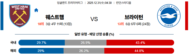 12월31일 웨스트햄:브라이턴 프리미어리그 분석 및 예측 스포츠중계:스포츠무료중계