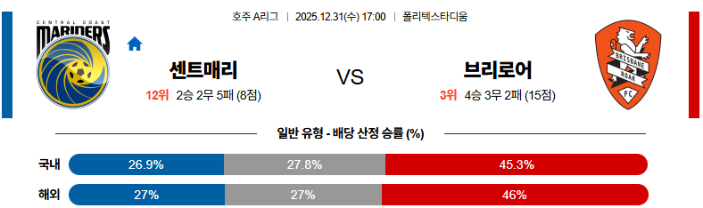 12월31일 센트럴코스트:브리즈번 호주A리그 분석 및 예측 스포츠중계:스포츠무료중계