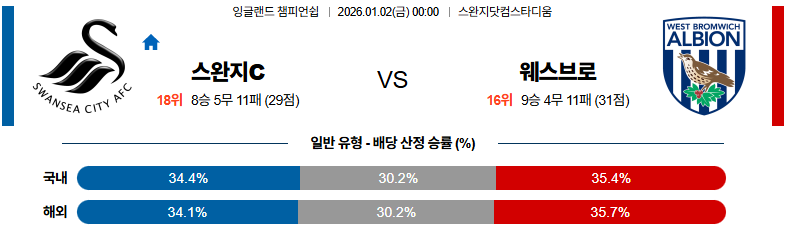 01월02일 스완지시티:웨스트브로미치 잉글랜드챔피언쉽 분석 및 예측 스포츠중계:스포츠무료중계