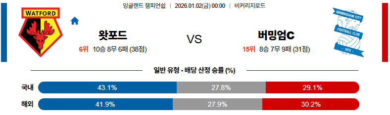 01월02일 왓포드:버밍엄시티 잉글랜드챔피언쉽 분석 및 예측 스포츠중계:스포츠무료중계