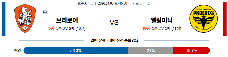 01월03일 브리즈번:웰링턴피닉스 호주A리그 분석 및 예측 스포츠중계:스포츠무료중계