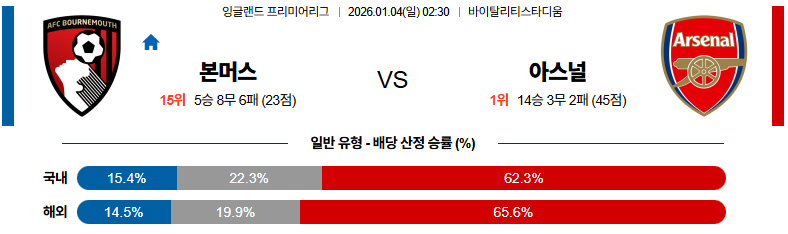 01월04일 본머스:아스널 프리미어리그 분석 및 예측 스포츠중계:스포츠무료중계