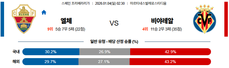01월04일 엘체:비야레알 라리가 분석 및 예측 스포츠중계:스포츠무료중계