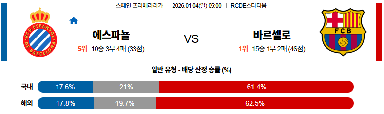 01월04일 바르셀로나:에스파뇰 라리가 분석 및 예측 스포츠중계:스포츠무료중계