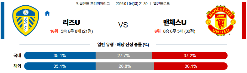 01월04일 리즈:맨유 프리미어리그 분석 및 예측 스포츠중계:스포츠무료중계