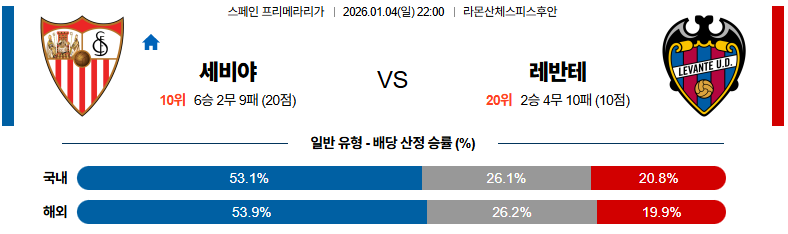 01월04일 세비야:레반테 라리가 분석 및 예측 스포츠중계:스포츠무료중계