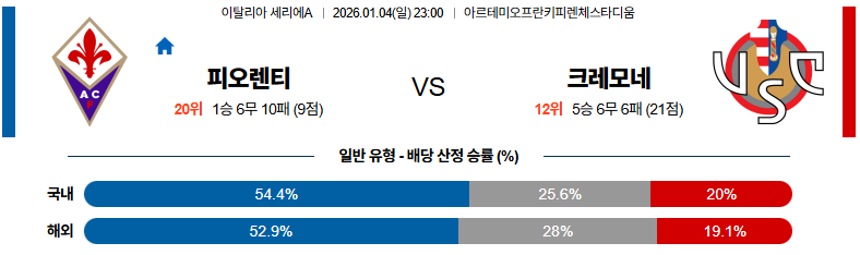 01월04일 피오렌티나:크레모네세 세리에A 분석 및 예측 스포츠중계:스포츠무료중계