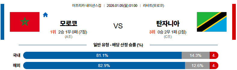 01월05일 모로코:탄자니아 CON네이션스리그 분석 및 예측 스포츠중계:스포츠무료중계